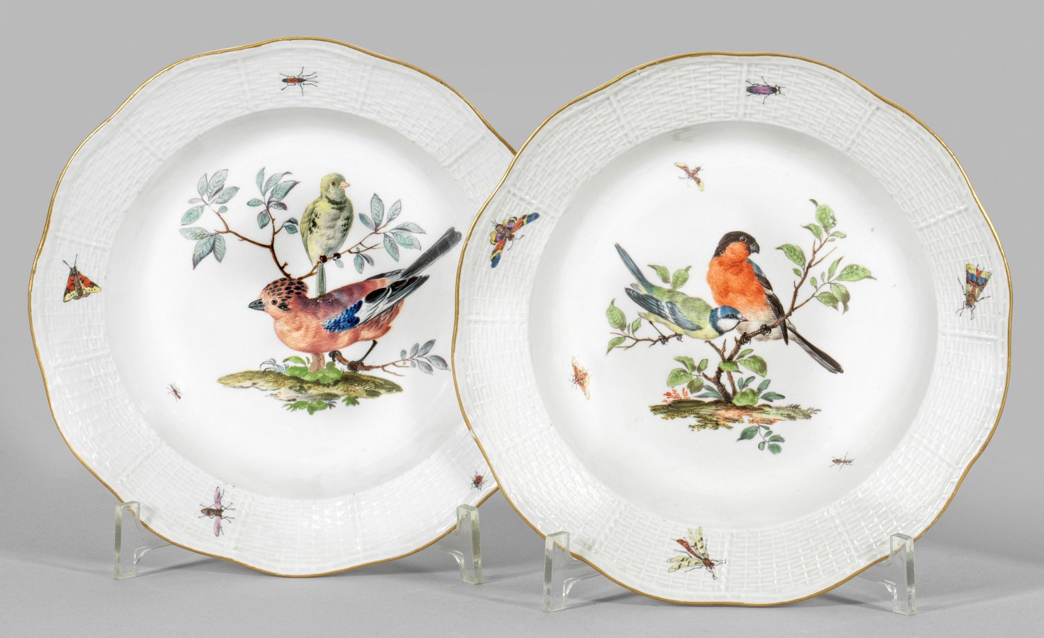 Vertiefter Spiegel, Altozier-Reliefrand. Im Spiegel je zwei Vögel auf einem Ast sitzend, umgeben von einzelnen Insekten in polychromer Malerei. Goldrand. Gold und Malerei ber.; Rand und Stand minim. best.; Schwertermarke. D. 22,5 cm.