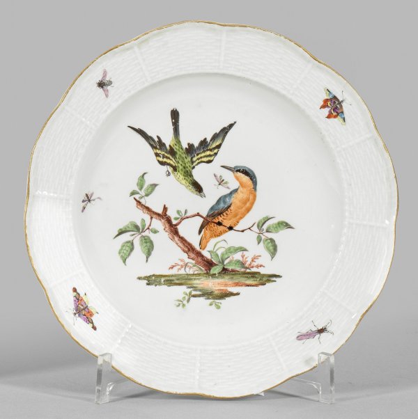 Leicht vertiefter Spiegel, Altozier-Reliefrand. Im Spiegel zwei Vögel, einer im Flug, einer auf einem Ast sitzend; auf der Fahne einzelne Insekten in polychromer Malerei. Goldrand. Gold und Malerei ber.; Rand minim. best.; Schwertermarke. D. 24,5 cm.