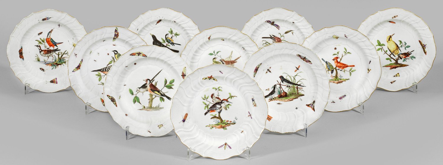 Leicht vertiefter Spiegel und passig geschwungener Rand mit Neuozier-Relief. Im Spiegel zwei bzw. drei Vögel in naturalistischer Umgebung sitzend, umgeben von einzelnen Insekten in polychromer Malerei. Goldrand. Gold und Malerei ber.; Schwertermarke. D. 24,5 cm.