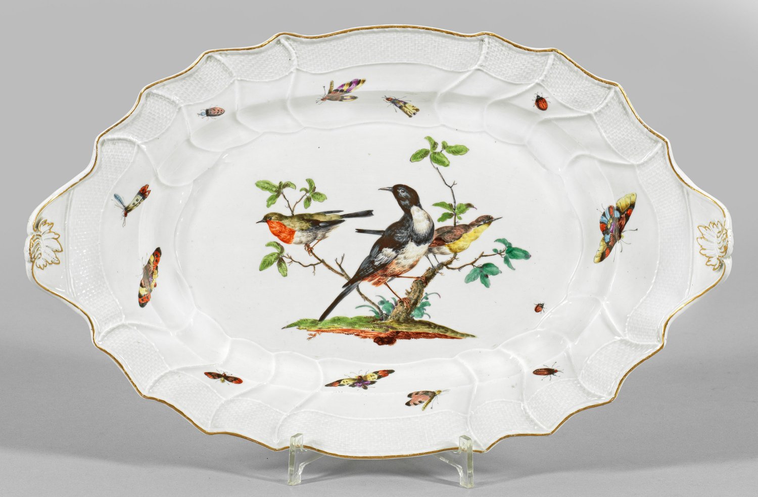 Ovale Form mit seitlichen Griffen und vertieftem Spiegel, passig geschwungener Rand mit Neuozier-Relief. Im Spiegel drei Vögel in naturalistischer Umgebung sitzend, umgeben von einzelnen Insekten in polychromer Malerei. Goldrand. Gold und Malerei ber.; Schwertermarke. L. 44 cm.