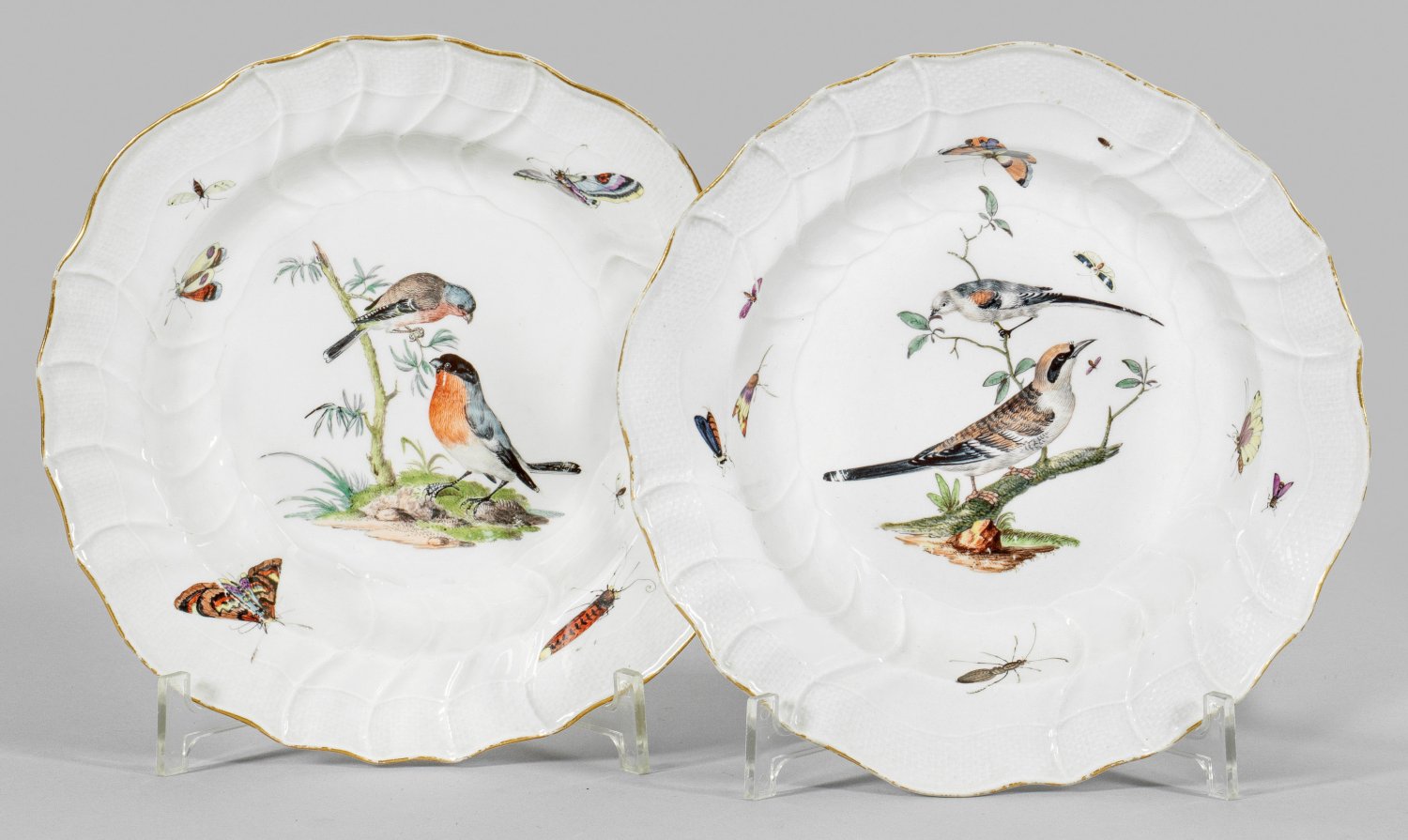 A pair of porcelain soup plates with birds and insect decor. Gold and painting rubbed, minor chipped. Crossed swords mark.