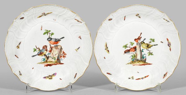 A pair of deep porcelain plates with birds and insect decor. Gold and painting rubbed. Crossed swords mark.