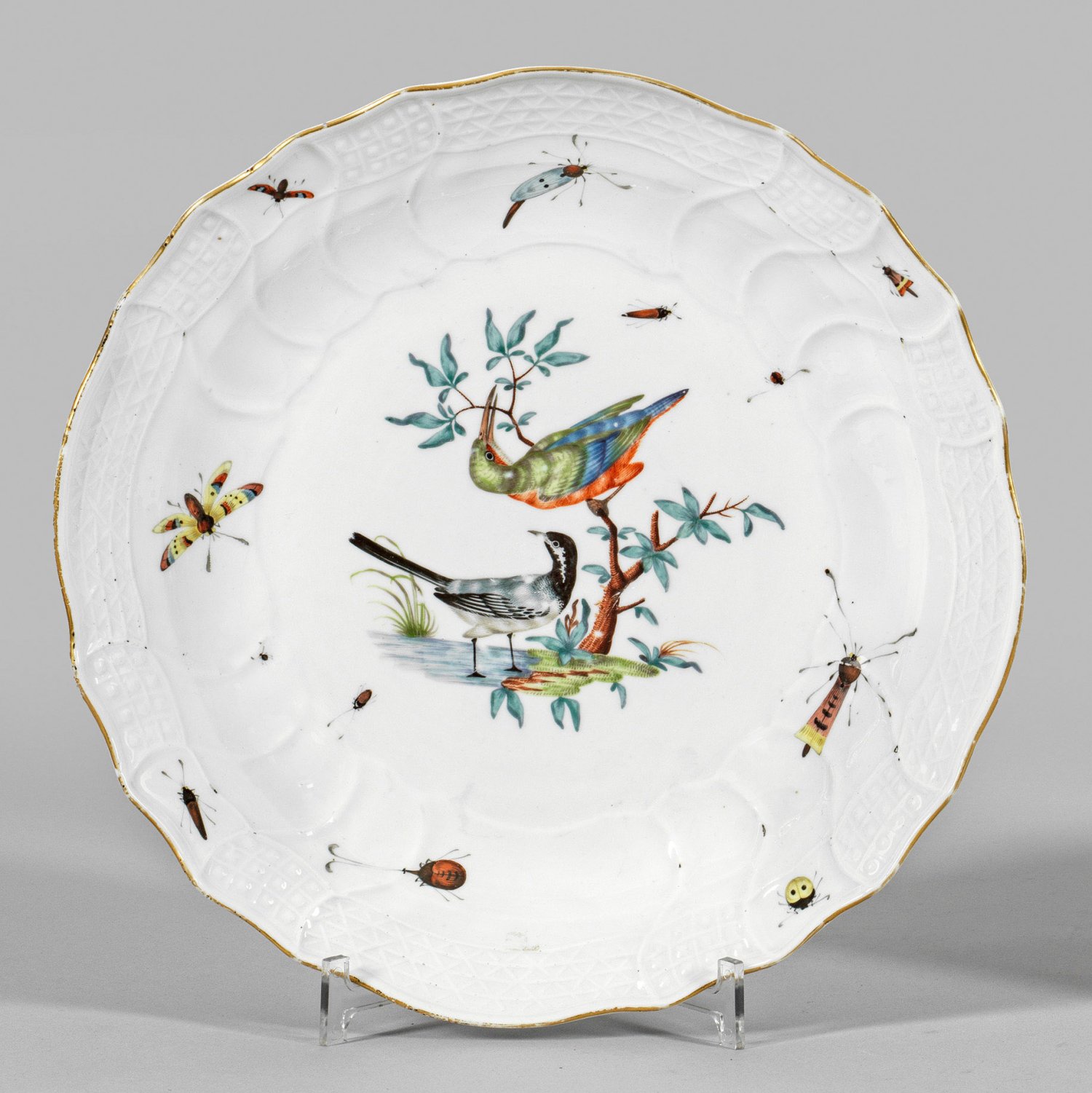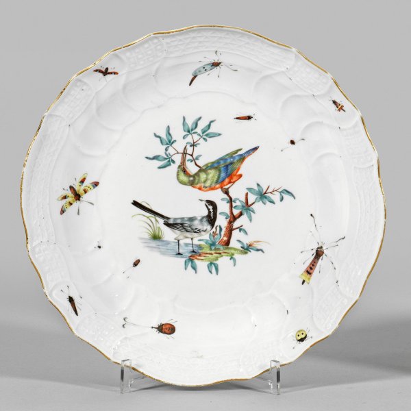 Runde Grundform mit vertieftem Spiegel und Neubrandenstein-Reliefrand. Im Spiegel zwei Vögel auf einem Ast sitzend, auf der Fahne und in vier unreliefierten Randsegmenten einzelne Insekten in polychromer Malerei. Goldrand. Gold und Malerei ber.; Rand und Stand best.; Schwertermarke. H. 7 cm. D. 35 cm.