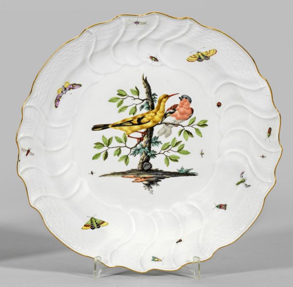 Runde Grundform mit vertieftem Spiegel und Neubrandenstein-Reliefrand. Im Spiegel zwei Vögel auf einem Ast sitzend, auf der Fahne und in vier unreliefierten Randsegmenten einzelne Insekten in polychromer Malerei. Goldrand. Brandfleck, Gold und Malerei minim. ber.; Schwertermarke. H. 7 cm. D. 39 cm.