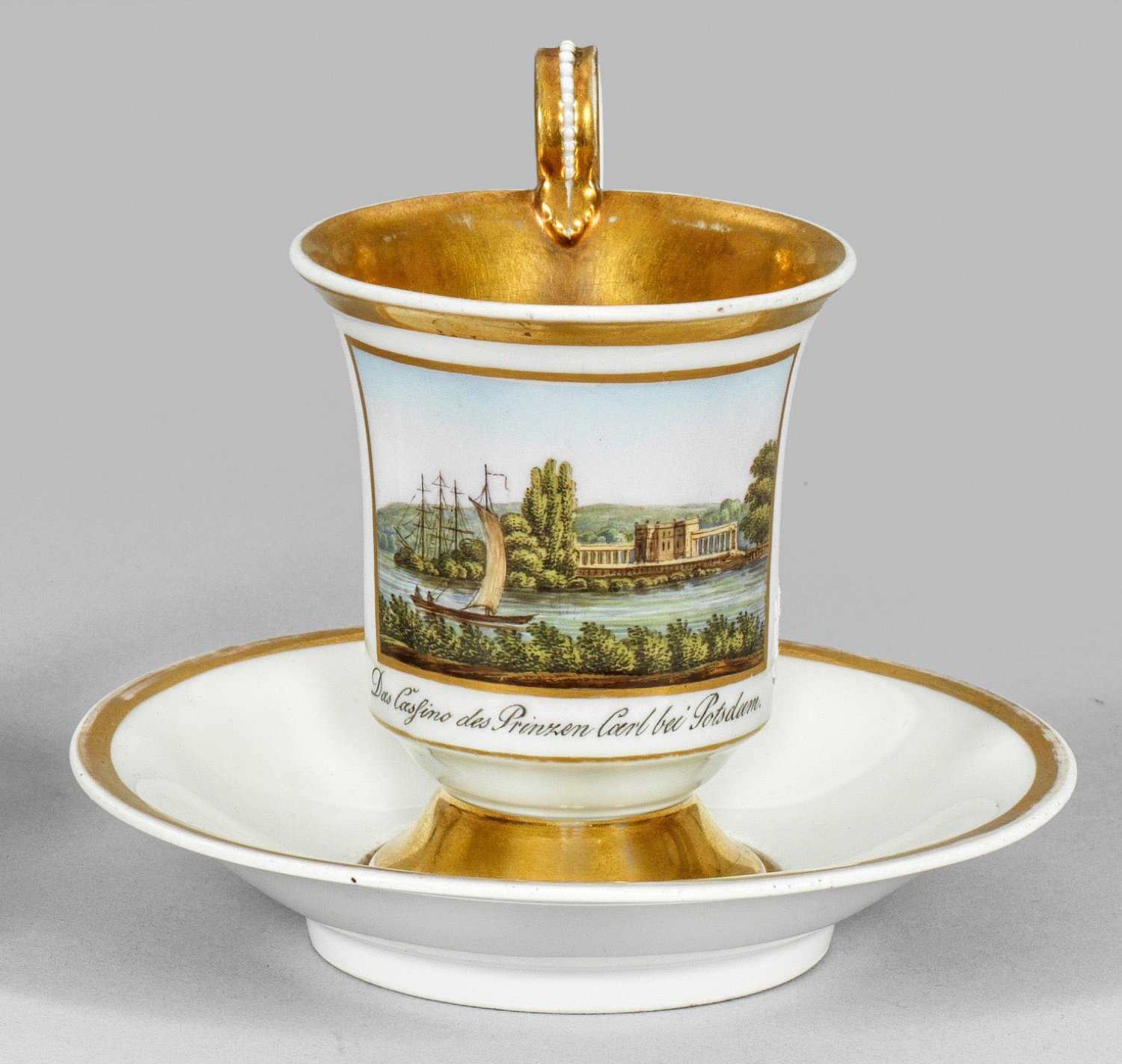 auf Untertasse. Glockenbecherform mit Rosettenhenkel. Schauseitige, goldgerahmte Reserve mit Ansicht des 1824 nach Plänen von Karl Friedrich Schinkel erbauten Casinos Glienicke von Prinz Carl von Preußen am Jungfernsee bei Potsdam. Polychrome Malerei sowie Innenwandvergoldung. Unw. ber.; Zepter- und teilw. Malereimarke. H. 11,5 cm.