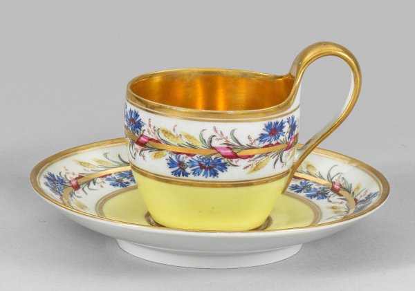 auf Untertasse. Campanerform. Auf der Wandung und im Spiegel zartgelber Fond sowie Bordüre aus Kornblumen und Ährengebinden mit Purpurband um Goldreif. Polychrome Malerei. Golddekor. Innenwandvergoldung. Zepter- und Malereimarke. H. 7,5 cm.