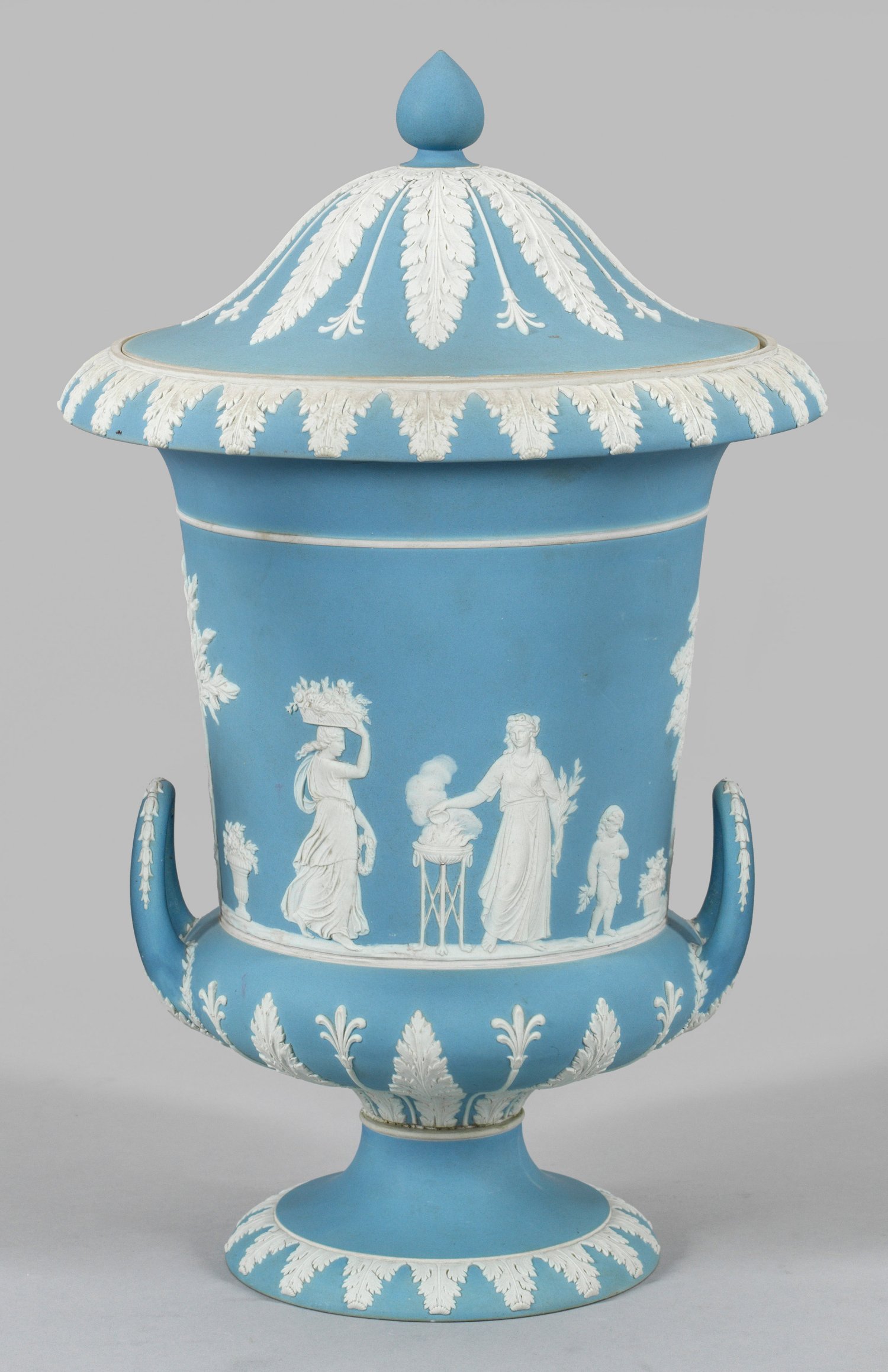 Hellblau-weiße, sog. Jasperware (Steingut). Auf rundem Fuß gedrückt-bauchiger, kelchartig abgesetzter Korpus mit weit ausschwingendem Rand. Seitliche Bogenhenkel und gewölbter Deckel mit stilisiertem Pinienknauf. Auf der Wandung klassizistischer Reliefauflagendekor aus antikisierenden, weiblichen Figuren und Putten in stilisierter Landschaft auf hellblauem Fond. Nach Vorlagen von John Flaxman. Umlaufende Akanthus- und Lanzettblattfriese. Jahresbuchstabe. Eingepresste Manufakturmarke. H. 44 cm.