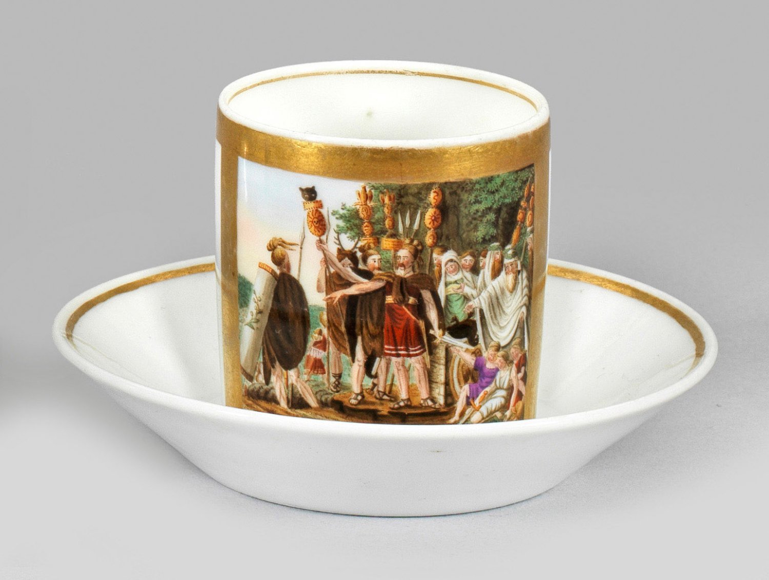 Zylindrisch mit Ohrenhenkel. Schauseitige, goldgerahmte Reserve mit szenischer Darstellung eines historisierenden Geschehens mit Schwertern und Standarten in polychromer Malerei. Spiegel mit Inschrift "Ludwig seiner Fritze." und Dat. 1827. Monogr. "M." bzw. "I.W.". Unterseitig gemarkt "W.".; H. 6,5 cm.