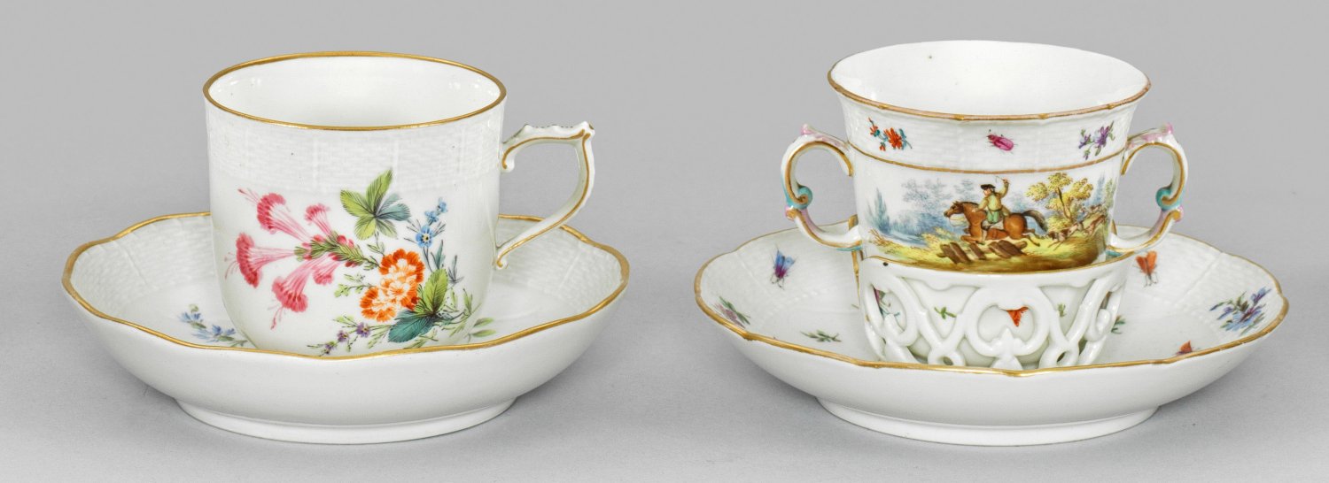 auf Untertassen. Reliefdekor "Altosier". U.a. Trembleuse. Auf der Wandung und im Spiegel verschiedene Jagdszenen bzw. Blumengebinde sowie gestreute Blüten und teilw. Insekten. Polychrome Malerei mit Goldstaffage. Teilw. ber.; Zepter- und teilw. Malereimarke. H. 7 cm - 7,3 cm.
