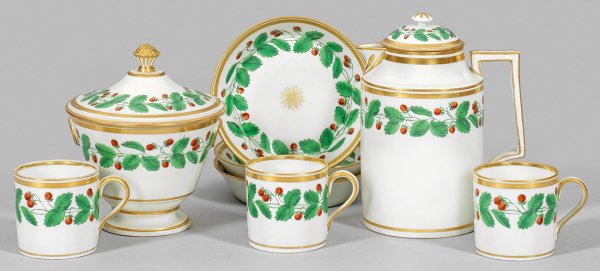 5-tlg.; Kaffeekanne, Zuckerdose, 3 Tassen mit Untertassen. Zylindrische und konische Form. Gekantete Henkel. Auf der Wandung und im Spiegel umlaufende Erdbeerrankenbordüre in polychromer Malerei. Reiche Goldstaffage. Maler-Nr. für Josef Zistler (tätig 1801 - 1825). Weißdreher-Nr. für Sebastian Kaltenböck und Johann Winkler; Jahresstempel 1(821) und 1(822). Manufakturmarke. Kannen-H. 17 cm.