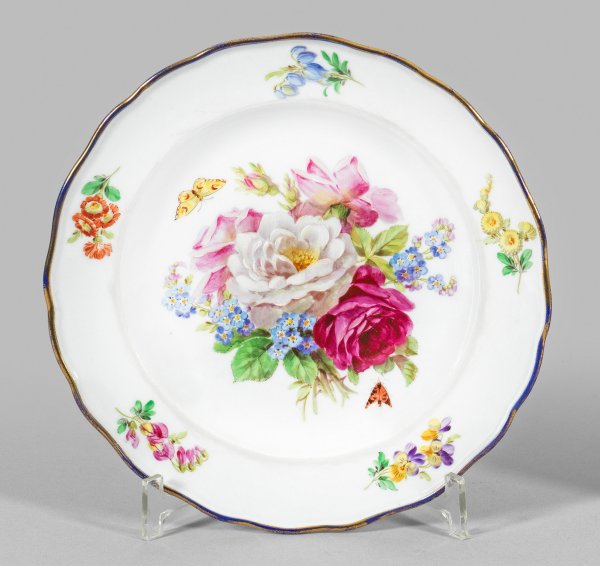 Runde Form, geschweifter Rand. Im flachen Spiegel großflächiges Bukett aus Rosen und Vergissmeinnicht in polychromer Malerei. Blauer, goldstaffierter Rand. Rücks. Wandaufhängung. Minim. ber.; Schwertermarke. D. 24 cm.