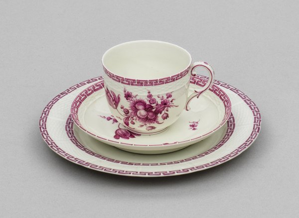 2-tlg.; Kaffeetasse mit Untertasse, Kuchenteller. Altozier-Reliefdekor mit Mäanderband um den Rand und den Spiegel. Blumengebinde- und Streublumen in purpurroter Camaieumalerei. Manufakturmarke.