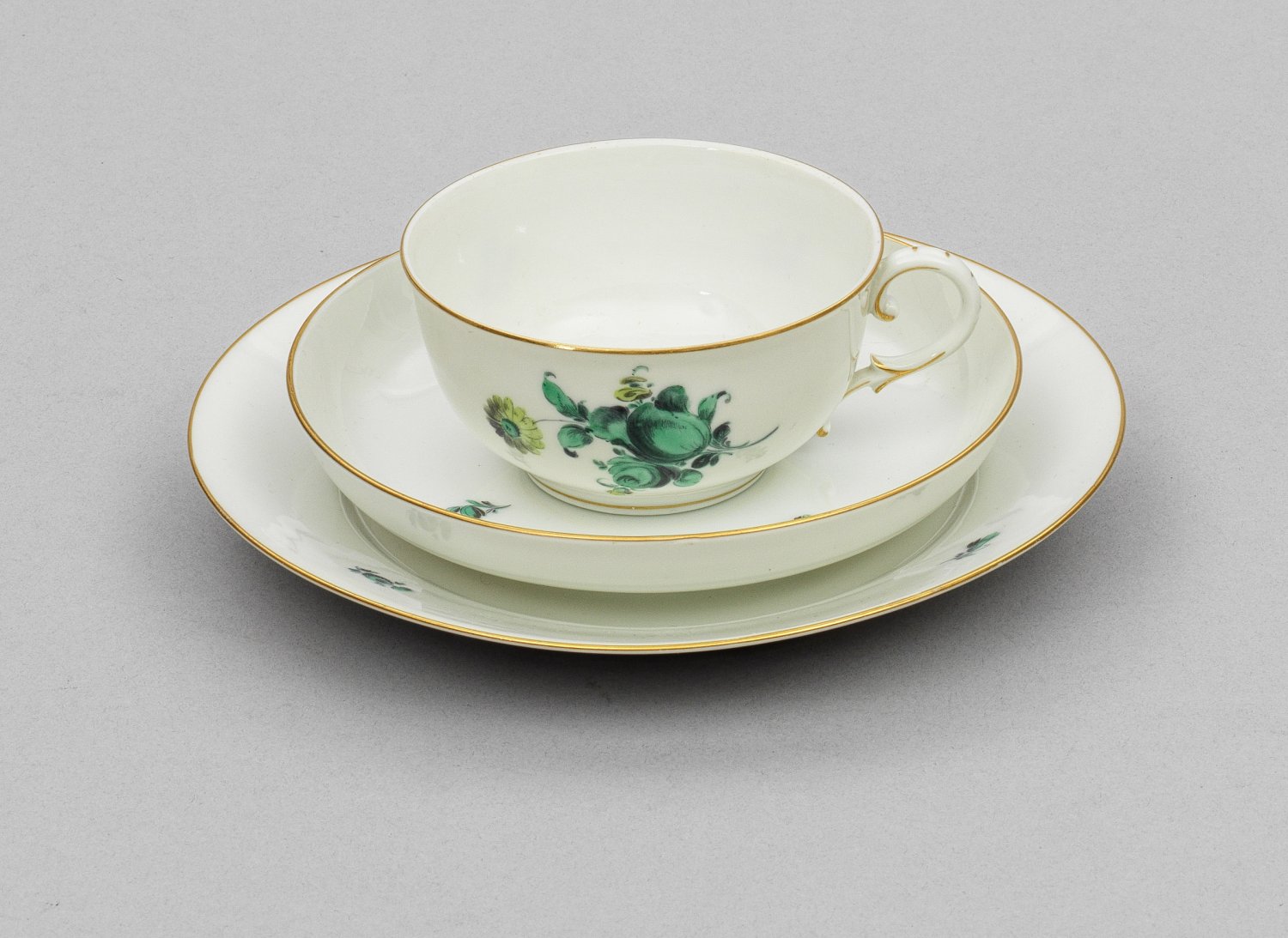 2-tlg.; Teetasse mit Untertasse, Kuchenteller. Auf der Wandung und im Spiegel Blütendekor in grüner Camaieumalerei mit Goldstaffage. Kuchentellerrand minim. ber.; Manufakturmarke. Teller-D. 19 cm.