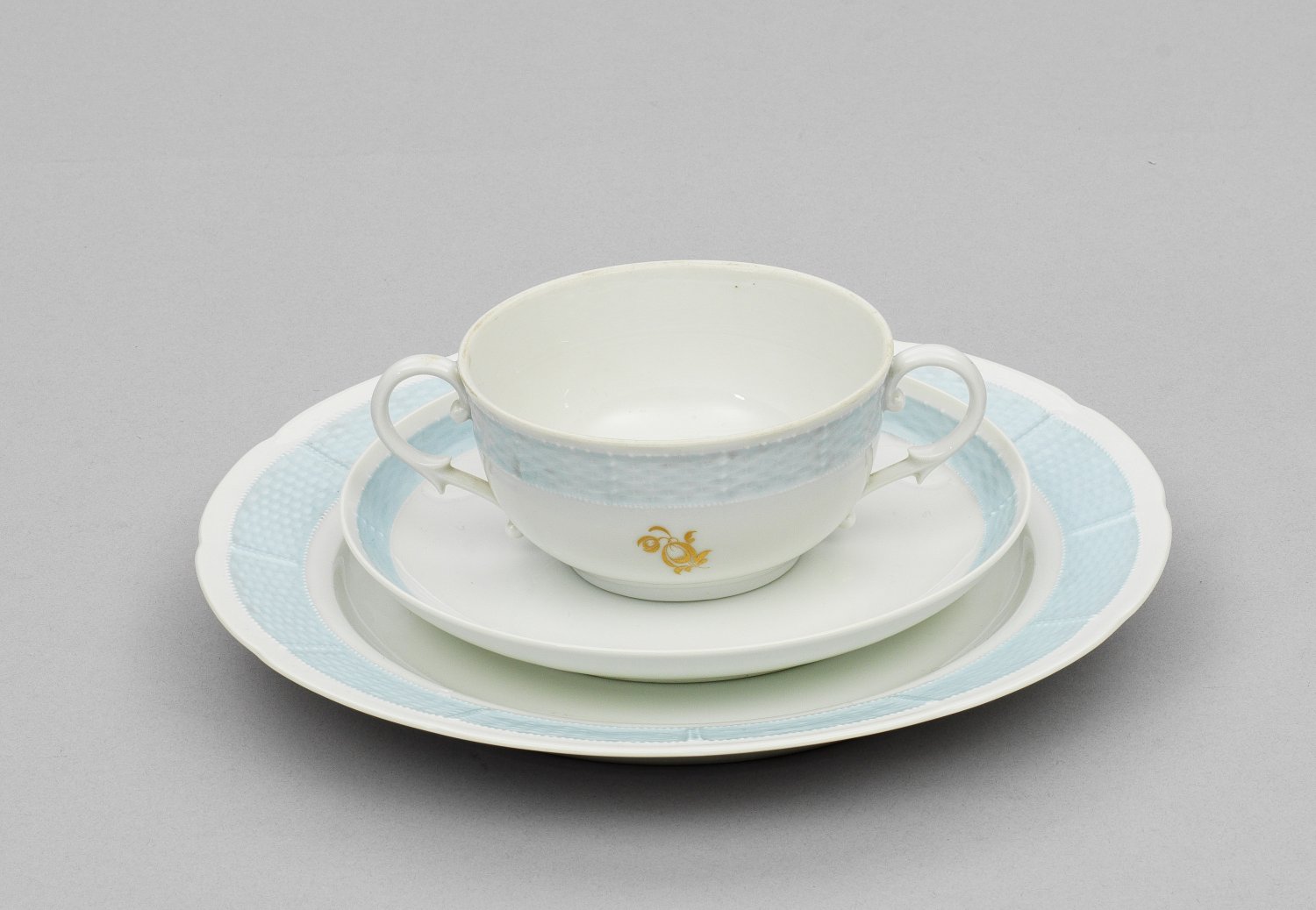 2-tlg.; Suppentasse mit Untertasse, Speiseteller. Hellblauer Reliefdekor "Altozier". Beidseitig der Wandung und im Spiegel kleiner Blütendekor in Goldmalerei. Manufakturmarke. Teller-D. 25 cm.