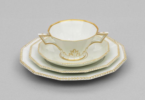 3-tlg.; Speise- und Dessertteller, Suppentasse mit Untertasse. Zwölfeckige Form mit reliefiertem, Gold staffiertem Perlrand. Manufakturmarke. Teller-D. 21 cm - 25 cm.