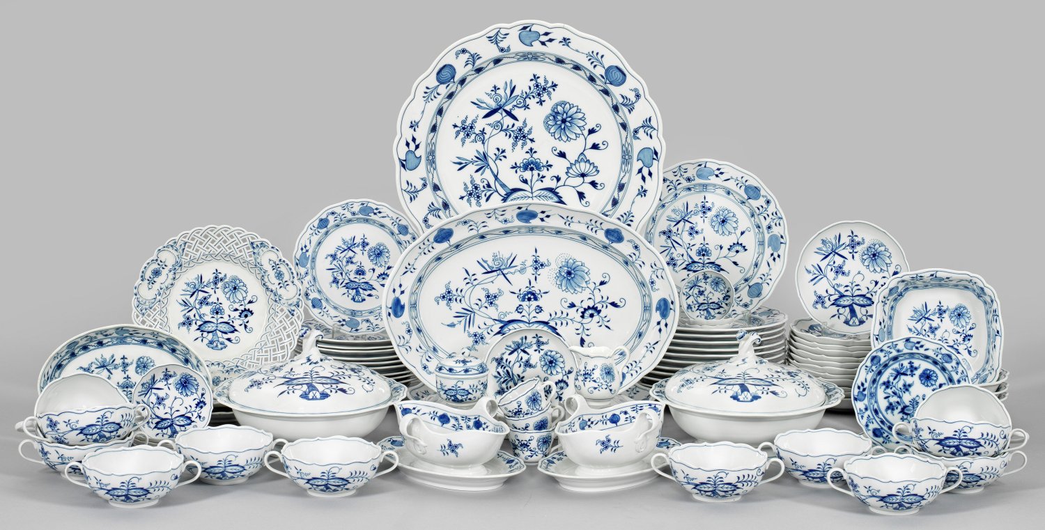 55-tlg.; 12 Speise-, 12 Kuchen-, 2 Brotteller, 12 Suppen-, 3 Mokkatassen jeweils mit Untertassen, Zuckerdose, Sahnegießer, 2 Bratenplatten, Beilagen- und 4 Salatschalen, 2 Gemüsenäpfe, 2 Saucieren, Beilagenschüssel. Zwiebelmusterdekor in unterglasurblauer Malerei.; teilw. minim. best.; Brotteller mit Haarriss. Beigabe: 4 Kaffeeuntertassen, Teeuntertasse, 3 Speiseteller mit durchbrochen gearbeitetem Rand, teilw. besch.; Schwertermarke. Beilagenschüssel-D. 40 cm.