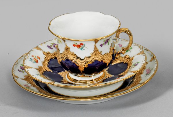 2-tlg.; Kaffeetasse mit Untertasse, Kuchenteller. Gebauchte Form mit c-förmig geschwungenen Volutenhenkeln. sog. "B-Form". Auf der Wandung und im Spiegel prächtiger Dekor aus reliefierten Rocaillebordüren in sog. Goldbronze als Rahmung für kobaltblaue bzw. weiße Fondflächen. Streublumendekor in polychromer Malerei. Entw. Ernst August Leuteritz. Schwertermarke. Tassen-H. 7 cm, Teller-D. 20 cm.