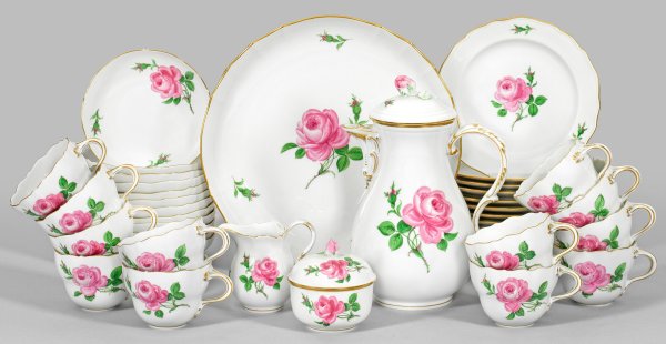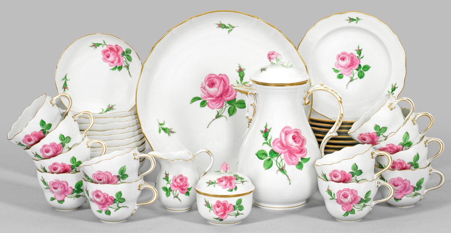 für 12 Personen. 28-tlg.; Kaffeekanne und 12 Kaffeetassen mit Untertassen, Sahnegießer, Zuckerdose, Kuchenplatte und 12 Kuchenteller. Feiner Rosendekor in polychromer Malerei. Goldstaffage. Ein Deckel innenseitig best.; Schwertermarke. Kannen-H. 23 cm. Kuchenplatten-D. 28 cm.