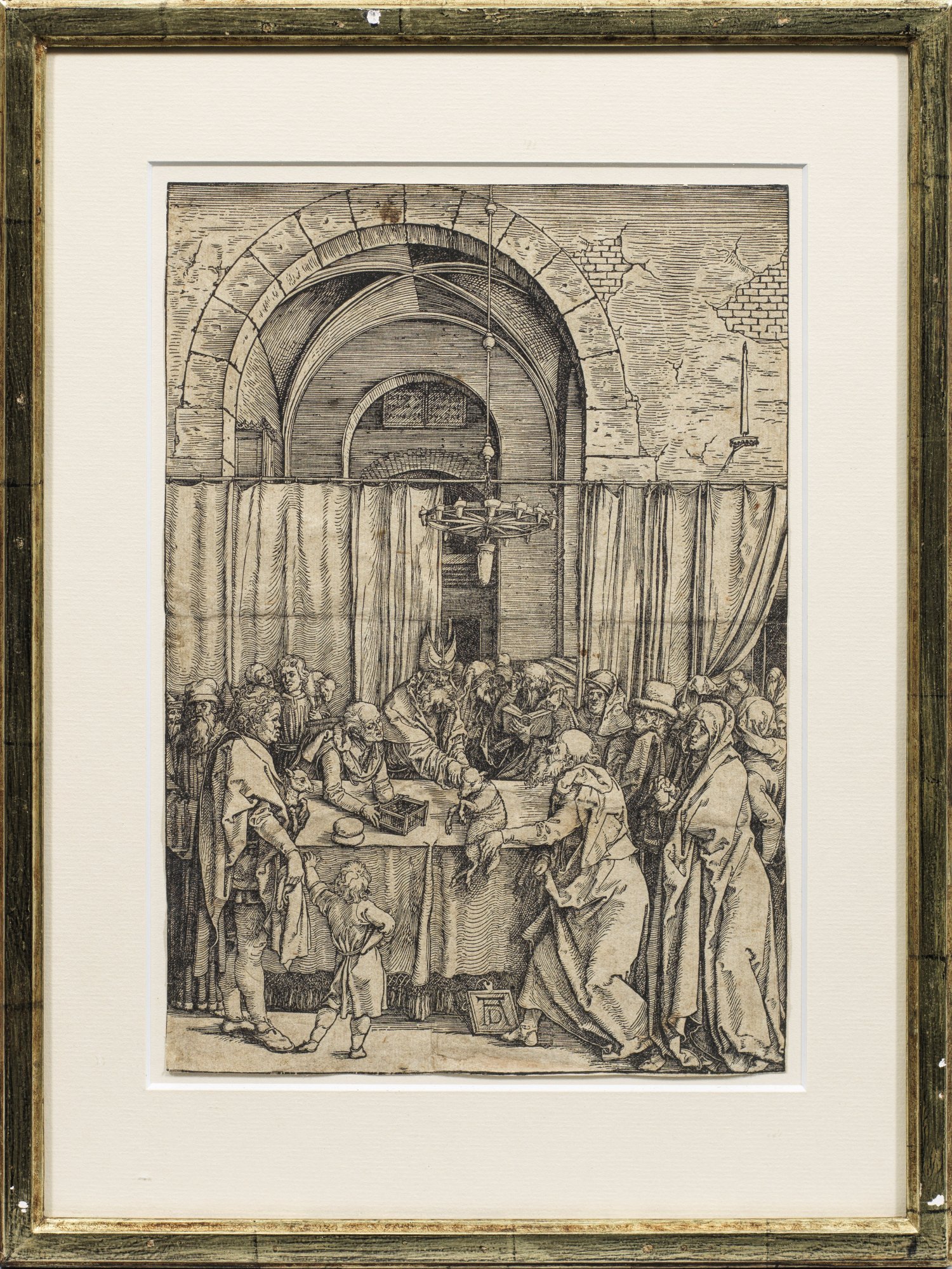 Holzschnitt/Papier, um 1590. Mittig unten im Stock auf einer Palette monogr.; Blatt 2 (von 20) aus Dürers Folge "Das Marienleben". Zustand d (nach Meder, Ausgabe ohne Text) mit Wasserzeichen Doppeladler mit Blume (Meder Wz. 222). Wvz. Hollstein 189, Bartsch 77, Meder 189 d, Schoch/Mende/Scherbaum 167. Auf die Einfassungslinie beschnitten. 29,5 cm x 21 cm. Rahmen.