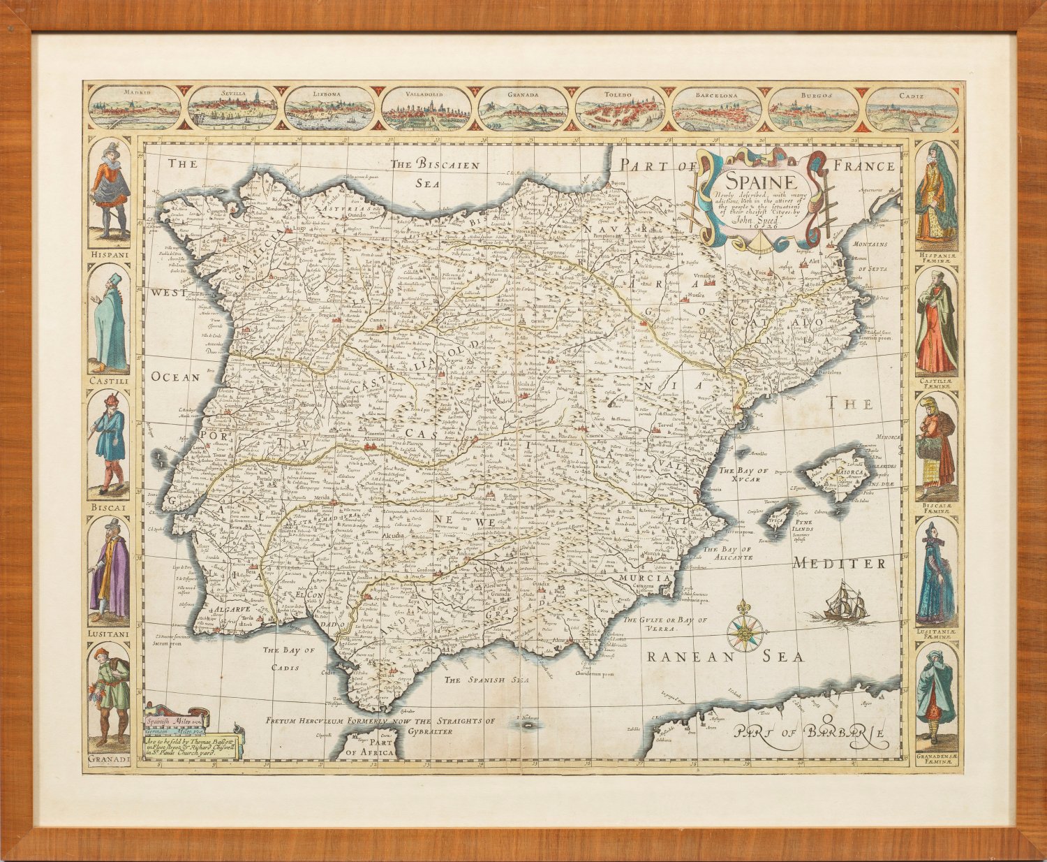 Altkolorierter Kupferstich von John Speed (1551/52 - 1629), erschienen in "Prospect of the Most Famous Parts of the World", published by Thomas Bassett und Richard Chiswell, London 1676. Grenzkolorierte Karte der Iberischen Halbinsel mit den Ländern Spanien und Portugal, flankiert von zehn Kostümdarstellungen und oberhalb abgeschlossen von neun Ansichten der wichtigsten Städte. Passepartoutausschnitt 41,8 cm x 54,2 cm. Rahmen.