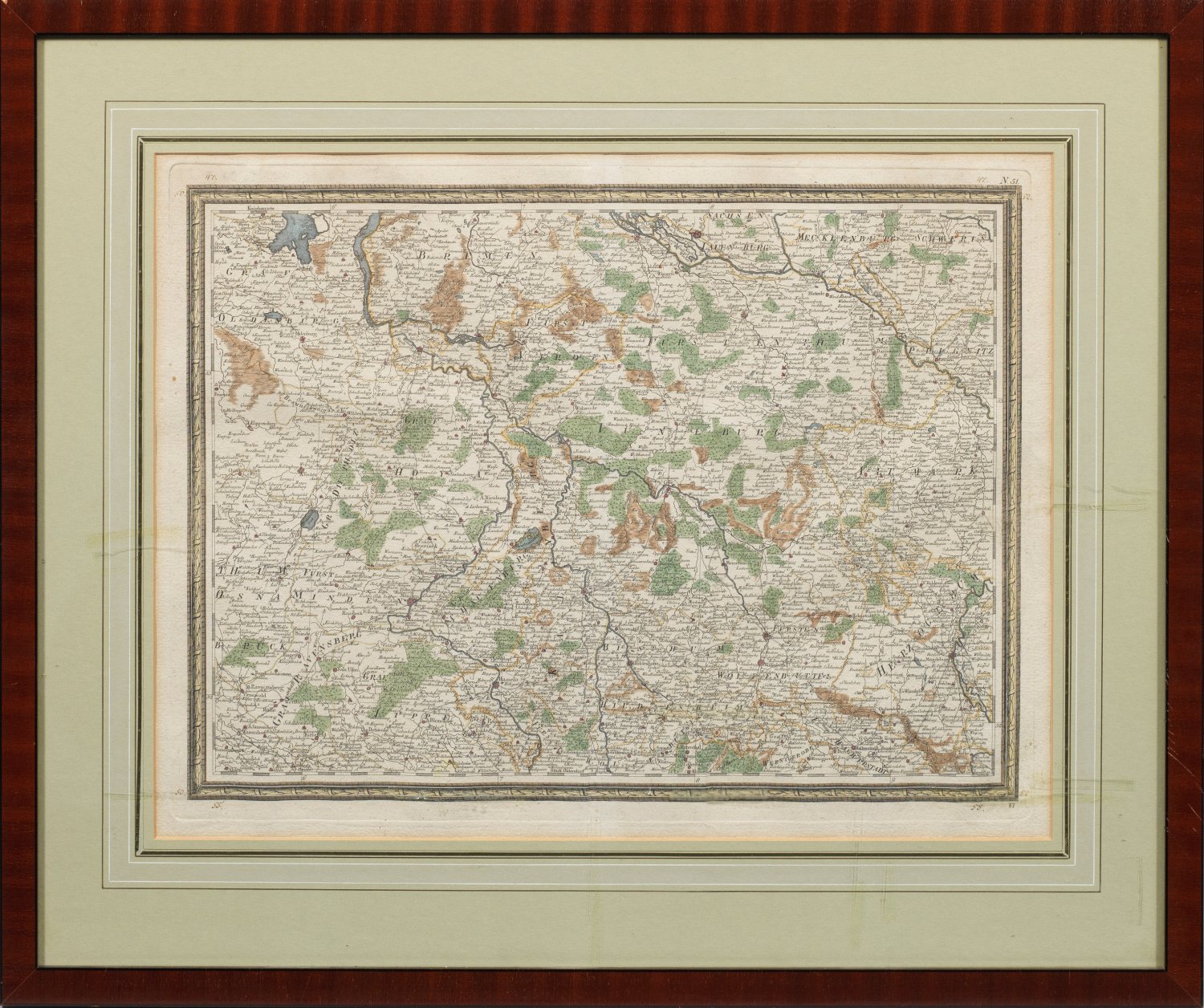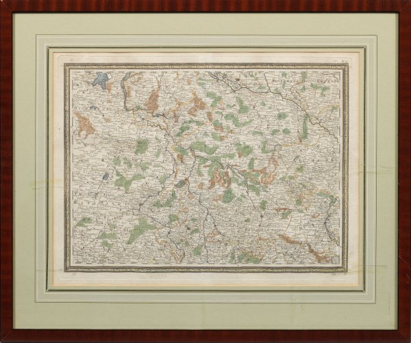 Altkolorierter Kupferstich/Bütten, um 1800. Gestochen von Kilian Ponheimer, erschienen bei Franz Anton Schrämbl in "Der Allgemeine Grosse Schrämblische Atlas", Blatt 51. Blatt VI. (von 24 (XXIV) Blättern) der "Neueste(n) Generalkarte von Deutschland". Detaillierte Karte Niedersachsens mit umlaufender Lorbeerbordüre. Platte 42 cm x 56 cm. Rahmen.