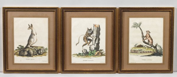 Alkolorierte Kupferstiche aus "Die Säugethiere in en nach der Natur" von Johann Christian Daniel Schreber, fortgesetzt von A. Goldfuß und J. A. Wagner, Erlangen 1775-1792. Enthalt sind: "Didelphys gigantea", "Didelphys murina", "Didelphys brachyuros", "Didelphys mustelina", "Didelphys macrotarsos", "Mus betulinus" und "Mus vagus", "Sciurus getulus", "Lepus Ogontona" sowie "Phoca hisdpida". 22,5 cm x 18,5 cm (Passepartoutausschnitt). Rahmen.