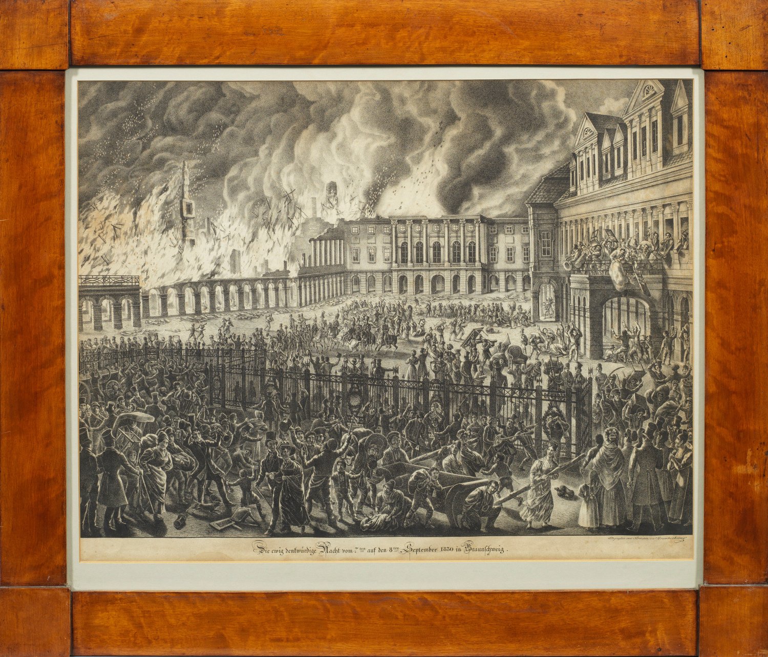 Seltenes Blatt mit historisch bedeutender Darstellung der Braunschweiger Stadtgeschichte: Am 7. September 1830 kam es zur sog. "Braunschweiger Revolution", auf der Bürger der Stadt sich gegen die Verschwendungssucht des Herzogs Karl II. von Braunschweig und Lüneburg auflehnten, indem sie das Alte Schloss plünderten und anschließend in Brand setzten.