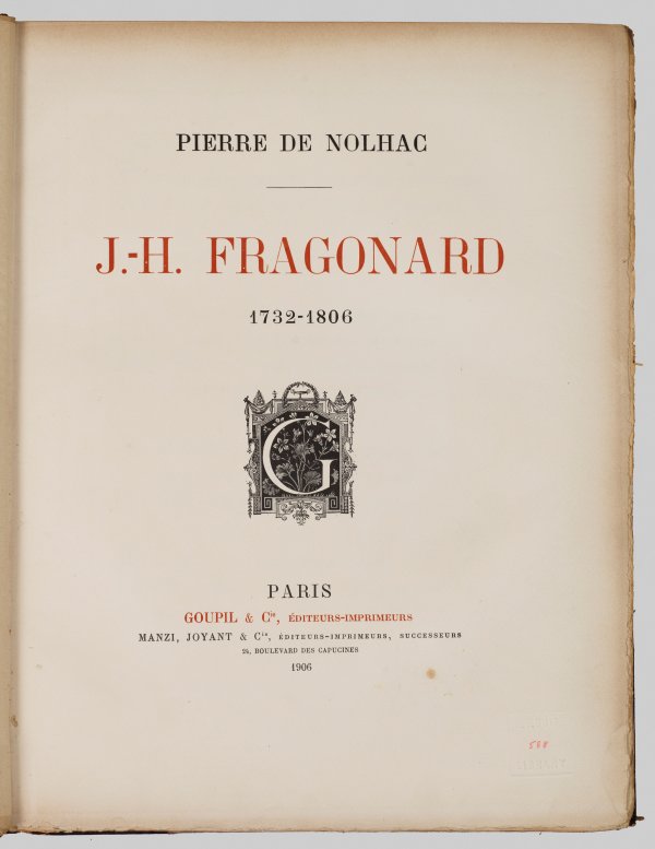 Study of the work of the French Rococo painter J.-H. Fragonard by Pierre de Nolhac, published in Paris, 1906. Limited and numbered. Minor signs of use, partially foxed. Not collated.