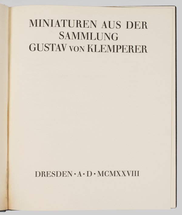 Jakob Hegner, Dresden-Hellerau, 1928. Mit Vorwort von Hans Buchheit. Zahlreiche Lichtdrucktafeln und Beschreibungen der dargestellten Miniaturen. Mit 150 Exemplaren limitiert. Auf geprägtem Bütten der Firma J. W. Zanders. Goldgeprägter Leineneinband. Nicht kollationiert. 35 cm x 29,5 cm.