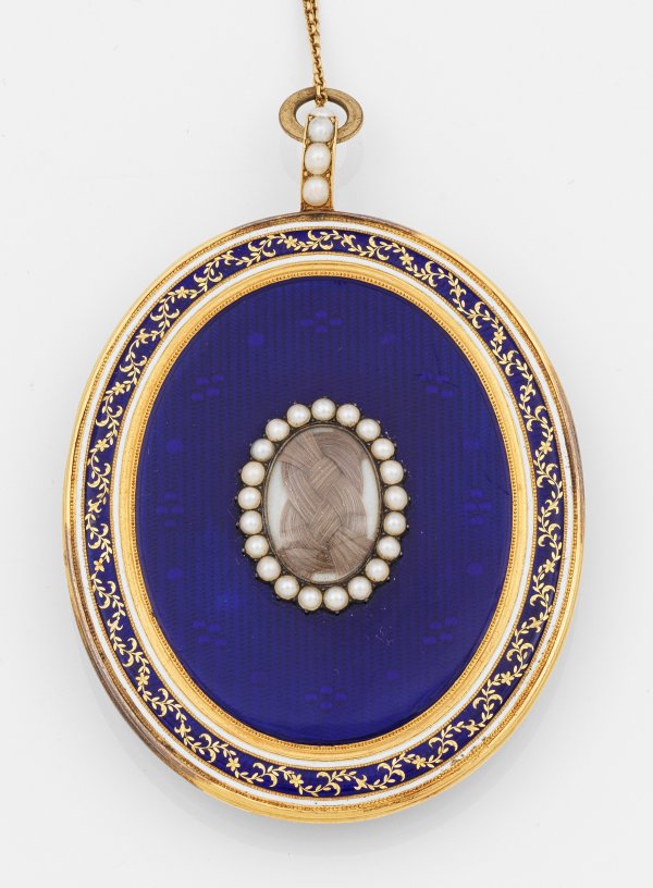 Um 1870/1880. Gelbgold, 18 k, tiefblau emailliert. Großes Ovalmedaillon mit geflochtener Haarsträhne im Zentrum, entouriert von Saatperlen. Rückseitig verglast und mit Saatperlen umrahmt. Feine, kurze Ankerkette. Ges.-Gew. ca. 80,99 g.