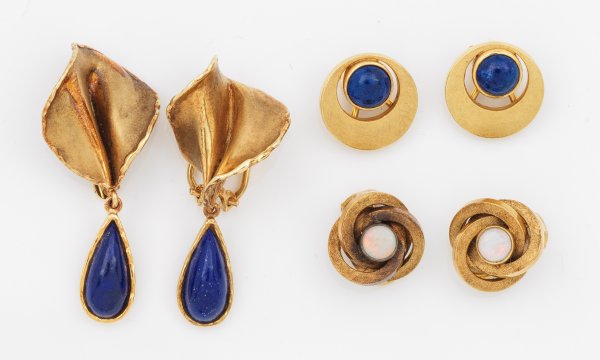 Three pairs of earrings set with lapis lazuli and crystal opal, in 14 k gold.