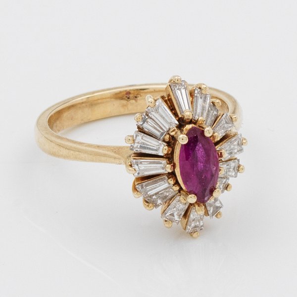 Gelbgold, gest. 585. Zentral besetzt mit einem taubenblutroten Rubin von ca. 0,50 ct. und entouriert von Diamant-Trapezen von zus. ca. 1,20 ct.; Gew. ca. 4,79 g.