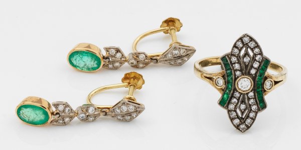 Ring und Paar Ohrringe. Gelbgold, teilw. gest. 750. Besetzt mit Diamanten und leuchtendgrünen Smaragden. Ges.-Gew. ca. 7,96 g.