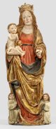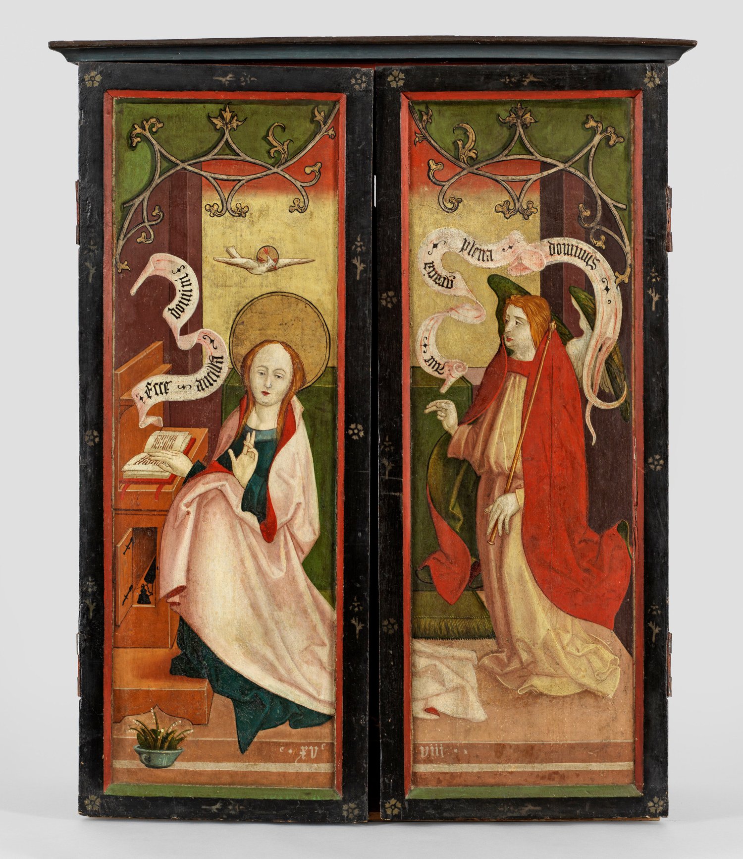 Hochrechteckiger, gefasster, bemalter und vergoldeter, hölzerner Schrein mit Schnitzwerk und zwei in Tafelmalerei ausgeführten Flügeln aus dem Umkreis von Hans Schäufelein (um 1480/85 - 1538/40), ausgeführt wohl für einen hohen Kleriker. Auf den Flügelaußenseiten szenische Darstellung der Verkündigung Mariens durch den Erzengel Gabriel in einem Interieur unter filigranem Akanthuswerk. Auf der linken Seite die Jungfrau Maria mit langem, offenem Haar und Scheibennimbus, an einem altarartigen Möbel in einem aufgeschlagenen Buch lesend; über ihr eine Taube als Symbol für den Heiligen Geist, unter ihr ein Topf mit Maiglöckchen als Symbol für die jungfräuliche Empfängnis, Demut und Bescheidenheit Mariens. Ihr gegenüber auf der rechten Bildseite stehend Gabriel mit langem Heroldsstab in seiner linken Hand. Den Figuren zugeordnet Schriftbänder mit lateinischen Textzeilen "Ecce ancilla domini" ("Siehe, die Magd des Herrn") und "Ave gratia plena dominus (tecum)" ("Sei gegrüßt, du voll der Gnade! Der Herr ist mit dir!") nach dem Lukas Evangelium, die zugleich Teil der häufigen Gebete "Angelus Domini", "Ave Maria" und "Rosenkranz" sind. Auf den Flügel-Innenseiten die jungfräulichen Heiligen Dorothea und Genoveva von Paris vor Wandteppichen unter Halbrundbögen mit Akanthusranken stehend: Dorothea mit Blumenkranz und -korb, zu ihren Füßen das Jesuskind mit Rosenstängel; Genoveva mit brennender Kerze als Attribut. Am Unterrand der Flügel die Datierung "1508". Der Mittelschrein mit korrespondierend gestalteter, gemalter Tapisserie, die obere, goldene Fläche der Rückwand mit punziertem Muster; vorderseitig bekrönt durch ein geschnitztes, gotisches Maßwerk mit Akanthusranken. Im Schrein eingestellt eine spätgotische Mondsichelmadonna aus geschnitztem, gefasstem und partiell vergoldetem Holz, rücks. gehöhlt; Maria in bodenlangem Gewand stehend, das Christuskind auf ihrer rechten Hand sitzend, zu ihren Füßen flankiert von zwei Engeln, welche die Mondsichel festhalten; Fassung übergangen u. rest., linke Hand Mariens erg.; Beigefügt zwei Messing-Scheibenleuchter. Schrein H. ca. 119 cm, B. vorne ca. 98 cm, hinten ca. 91 cm; Flügel jeweils ca. 115 cm x 44,5 cm; Ges.-B. (ausgeklappt) ca. 180 cm.
