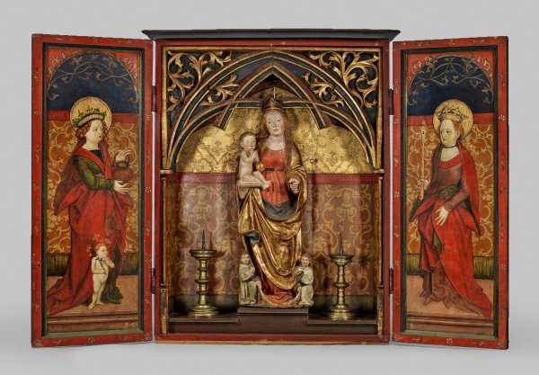 A painted double-winged South German probably Franconian home altarpiece depicting the Annunciation and the Saints Dorothea of Caesarea and Genevieve. In the central shrine a German carved, painted and gilt wooden sculpture of the Woman of the Apocalypse with two angels. Accompanied by two South German brass candlesticks. Polychromy of the sculpture overpainted and restored, left hand of Mary replaced.