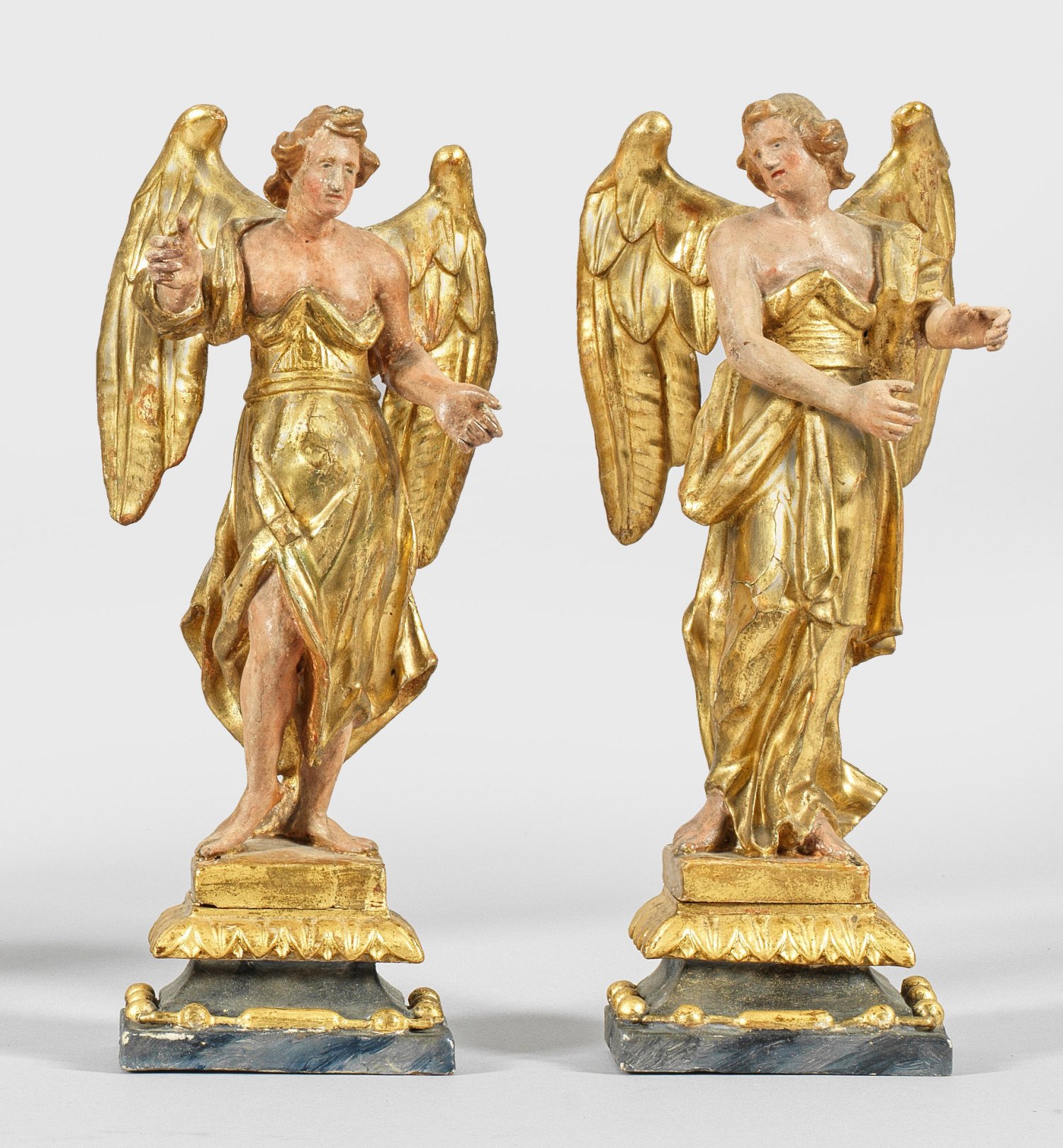 Gegenstücke. Lindenholz, geschnitzt, gefasst und vergoldet. Fassung überfangen. Vollplastisch gestaltete Statuetten im Josephinischen Stil, die jugendlichen Engel mit großen Flügeln, im Kontrapost stehend und in beredter, gestenreicher Pose agierend. Die frühklassizistischen, rechteckigen, abgestuften Plinthen bzw. Sockel mit einem Blattkranz und ornamentalem Perlschnurrelief. H. 23,5 cm.