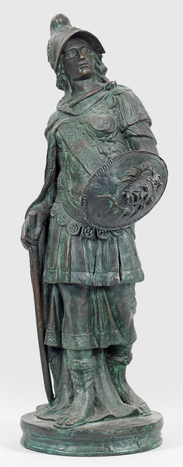 Bronze, in nuancierten dunklen, grünen bis braunen Tönen patiniert. Guss wohl des 19. Jhs. als Grand Tour-Objekt. Vollplastische Darstellung der griechischen Göttin der Weisheit, der Strategie, des Kampfes und der Künste in einer Rüstung mit Helm, das Schild mit dem reliefierten Haupt der Medusa haltend. Verkleinerte Version nach der berühmten, großen Renaissance-Bronze an der Loggetta zu Füßen des Glockenturms am Markusplatz in Venedig, erbaut und mit Figuren ausgeschmückt 1538-1546 durch den Architekten und Bildhauer Jacopo Sansovino. H. 73,5 cm.