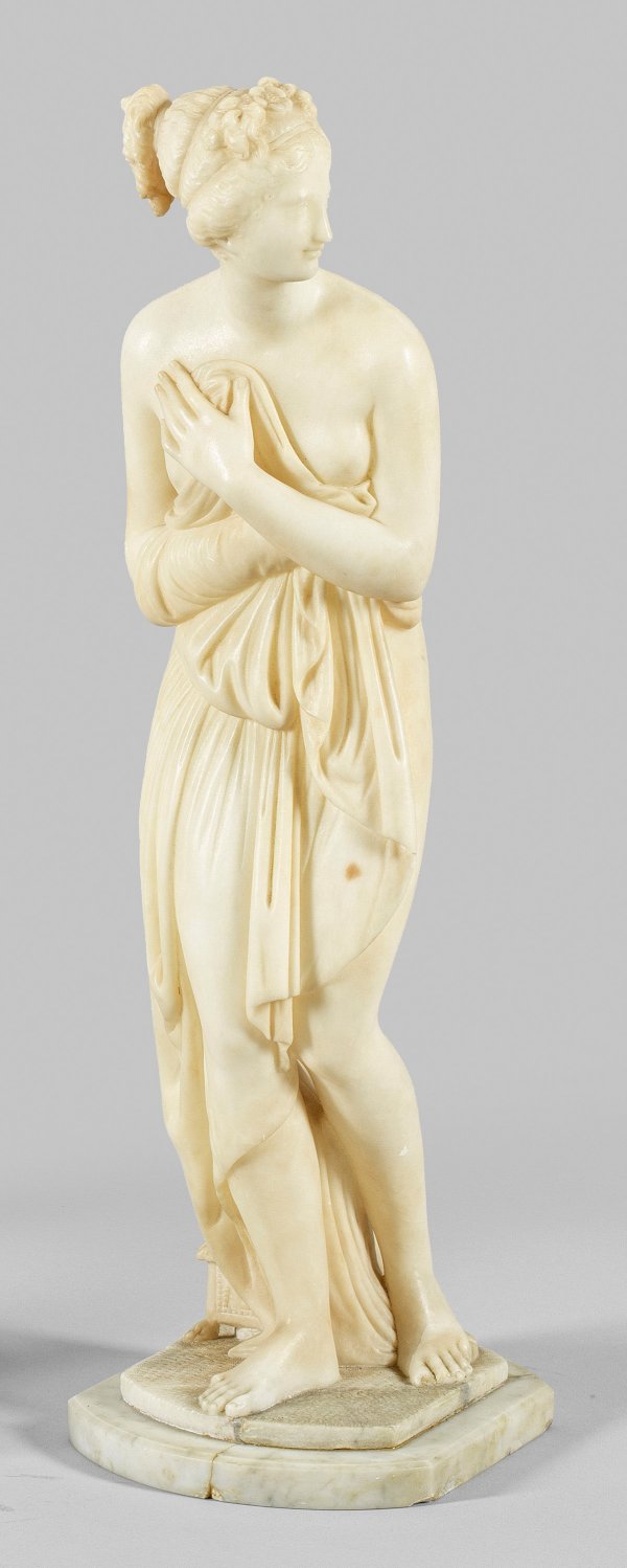 Alabaster. Italienische Arbeit des 19. Jhs. nach der berühmten, 1802-1812 ausgeführten klassizistischen Marmorskulptur, die ursprünglich als Ersatz für die durch Napoleon Bonaparte nach Frankreich entführte und 1815 zurückgekehrte antike "Venus Medici"-Skulptur in den Uffizien in Florenz dienen sollte. Zwar ist die "Venus Italica" von der "Venus Medici" inspiriert, doch weist sie deutliche Unterschiede auf- insbesondere in der Haltung der Hände und dem schamhaft vor den Körper gehaltenen Tuch. Plinthe und linker Fuß besch.; H. 60 cm.