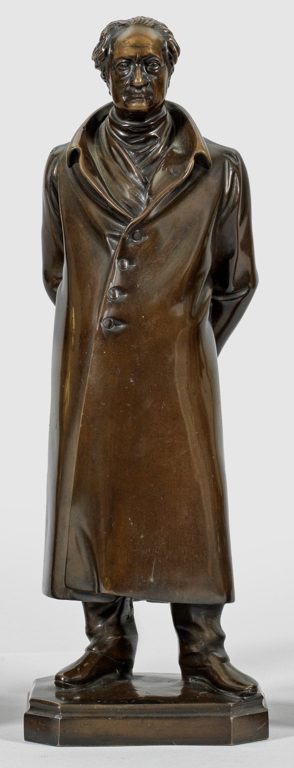 Bronze, dunkelbraun patiniert. Guss wohl um 1900. Darstellung Goethes als Ganzfigur auf einer eckigen, leicht profilierten Plinthe stehend, die Hände in charakterlicher Pose hinter dem Rücken verschränkt. H. 36 cm.