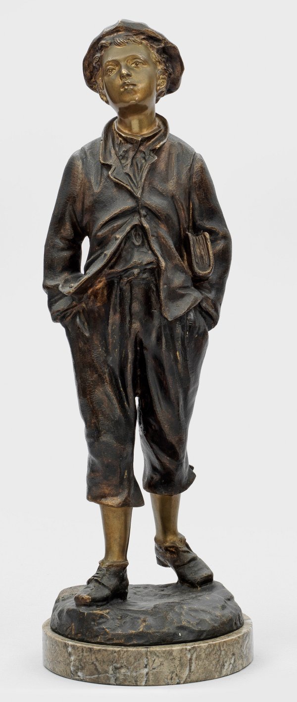 Bronze, goldbraun und dunkel patiniert. Bez. "Claudel". Hellgrauer Marmorsockel. Auf einer runden Plinthe stehender Knabe in lässiger Pose, mit Händen in den Hosentaschen und Buch unter dem Arm. Nach einem Modell der Belle Époque, Guss Ende 20. Jh.; Ges.-H. 54,5 cm.