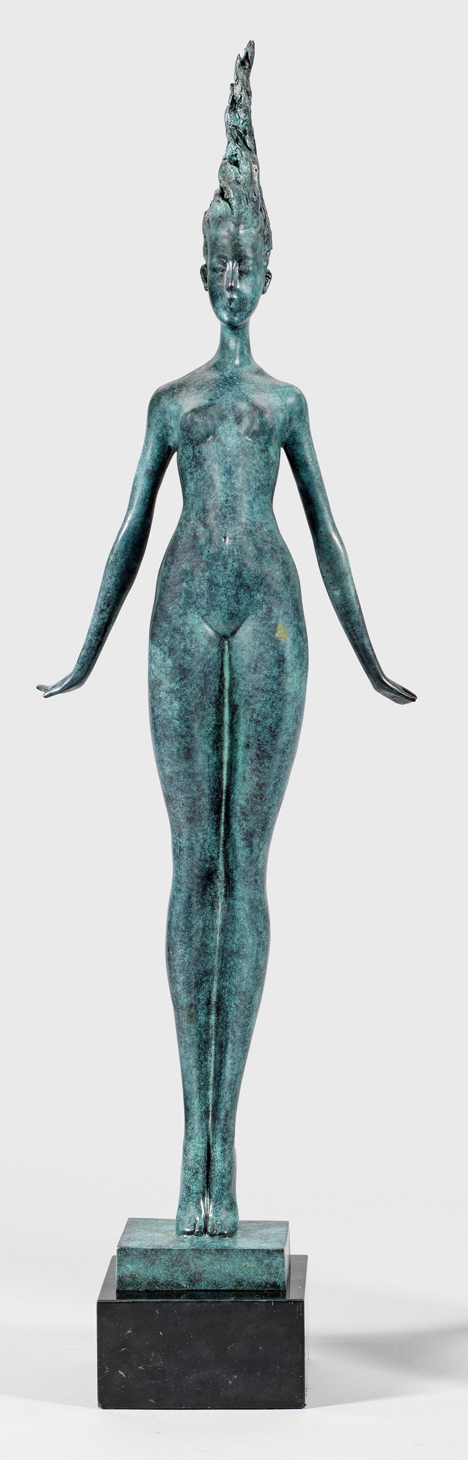 Bronze, graugrün patiniert. Sign.; Schwarzer Marmorsockel. Auf ihren Fußspitzen stehende Daphne im Moment der Verwandlung in einen Lorbeerbaum. Dargestellt ist diese als in den Proportionen überlängte Aktfigur einer jungen Frau in graziöser Pose mit hochgestreckter Brust, leicht nach hinten ausgestreckten Händen, überrascht geöffnetem Mund und sich empor zu einer hohen, spitzen Knospe verwandelndem Haar. Ges.-H. 100 cm.