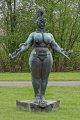 Bronze, braun patiniert, 1972. Gießerstempel der Kunstgießerei Schmäke, Düsseldorf. Monumentale, fantasiereiche Bronzeplastik des Wiener Künstlers, die zu den größten, je von Fuchs geschaffenen Skulpturen zählt. Auf einer passigen Plinthe hat Fuchs die biblische "Königin Esther" als Aktfigur geschildert, ihre mit einer Schlange und einem Blumenstängel belegten Arme seitlich diagonal anhebend, die Haare mit Schnecken verziert und helmartig aufgetürmt. Die voluminös ausladenden Hüften und die quellenden, prallen, kugeligen Brüste sind Symbole ursprünglicher, archaischer Fruchtbarkeit und Weiblichkeit, wie sie sowohl aus der Altsteinzeit als auch von vor- und frühgeschichtlichen, hinduistischen und buddhistischen Kulturen bekannt sind, mit denen sich Fuchs intensiv befasste. In dem gleichen Sinne hat Fuchs die Attribute der Blume und der Schlange gewählt - ambivalente, vieldeutige Sinnbilder und Ursymbole. In der Bibel wird die jüdische Waise Esther als Königin, Frau des persischen Königs Ahasveros (Xerxes I.) durch Verhandlungsgeschick zur Retterin ihres Volkes, der Juden. Später stand Esther als eine der Neun Guten Heldinnen in der ikonographischen Reihe als Vertreterin des Judentums. Seit circa 1967 beschäftigte sich Ernst Fuchs, selbst jüdischer Abstammung, als bedeutende Hauptvertreter der Wiener Schule des Phantastischen Realismus mit der biblischen Figur der Esther. 1973 schenkte Ernst Fuchs dem befreundeten Künstler Salvatore Dalí einen Guss seiner "Königin Esther", heute im Theatermuseum von Salvador Dalí in Figuraras/Spanien. Weitere Exemplare und Versionen befinden an der 1972 von Fuchs erworbenen Villa Wagner in Wien (heute Privatmuseum Ernst Fuchs-Museum), außerdem vor dem ehemaligen "Kunsthaus Dr. Hans Hartl" in Freising. H. ca. 255 cm.