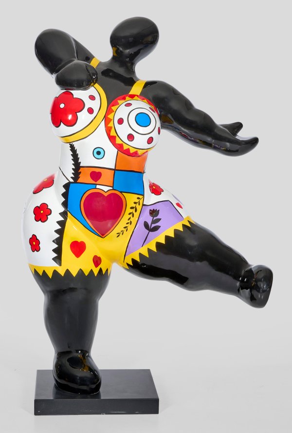 Kunststoff, schwarz lackiert und polychrom bemalt; schwarzer Steinsockel. Große, vollplastische, stilisierte Figur einer fröhlich tanzenden Frau, deren Lebenslust ihr Kleid mit Herzen- und Blumendessin entspricht. Diese ist durch die berühmten "Nana"-Plastiken der französischen Künstlerin Niki de Saint Phalle (1930 - 2002) inspiriert, welche seit Mitte der 1960er Jahren die Bildersprache der Pop Art auf sinnliche, farbenfroh gestaltete, weibliche, oft tanzende Figuren mit voluminösem Körper anwandte. Im Oktober 1965 stellte sie eine erste "Nana" in Paris aus, 1966 folgte eine riesige, erotisch konnotierte "Nana" vor dem Stockholmer Moderna Museet. Ihre 1974 in Hannover am Leibnizufer der Leine aufgestellten "Nanas" führten seinerzeit zu Proteststürmen. Ges.-H. 143 cm.