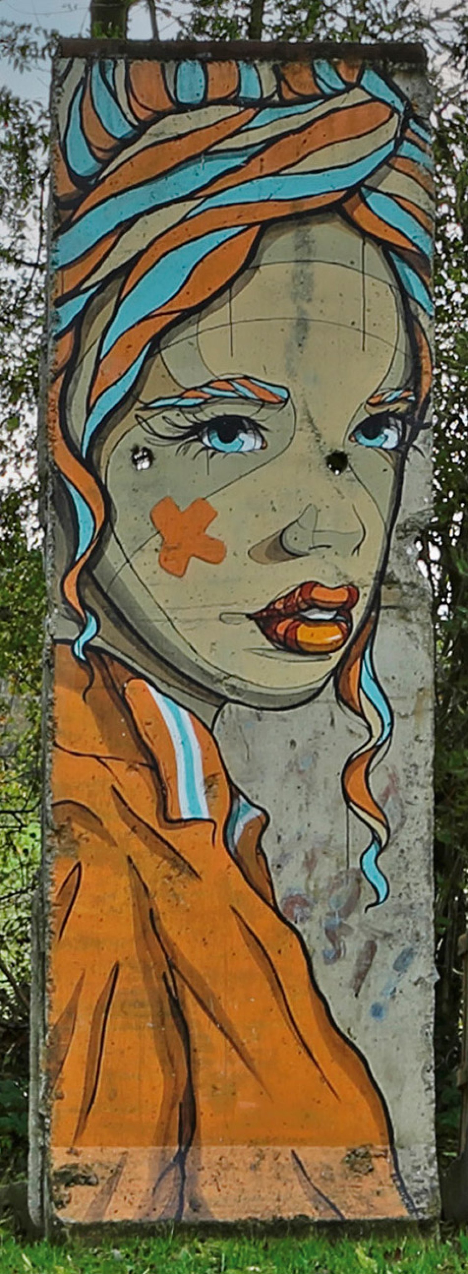 2020 entstandenes, sog. "Berlin Wall-painting". Großes, L-förmiges Stück der alten Berliner Mauer (Beton mit Stahl-Armierung) mit Bemalung durch El Bocho in unterschiedlicher Technik. Stencil-Sign. "EL BOCHO". Ausschnitthaft dargestellt ist ein Mädchen in orangefarbener Trainingsjacke, den Kopf im Halbprofil mit rotem, kreuzförmigem Pflaster auf der rechten Wange und langem, hochgestecktem Haar mit blonden, orangeroten und hellblauen Strähnen. Das Motiv eines Mädchens mit kreuzförmigem Pflaster auf der Wange gehört seit circa 2015 zu den wiederkehrenden Themen des Künstlers. In einer geringfügig abweichenden, mit diesem Mauerstück vergleichbaren Version hat El Bocho es auch als Grafik unter dem Titel "I regret nothing" vervielfältigt. El Bocho, dessen Identität anonym ist, gehört zu den bekanntesten deutschen Streetart- und Graffiti-Künstlern. Er studierte Grafik-Design und arbeitete danach beruflich mit Typographie und Plakatkunst. Seit 1996 ist er anonym mit Graffiti- und Street-Art im öffentlichen Raum aktiv. 2006 zog er von Frankfurt am Main nach Berlin. Außer in seiner heutigen Wahlheimatstadt Berlin und in Deutschland ist er weltweit tätig. H. ca. 360 cm; B. ca. 120 cm; T. 213 cm.