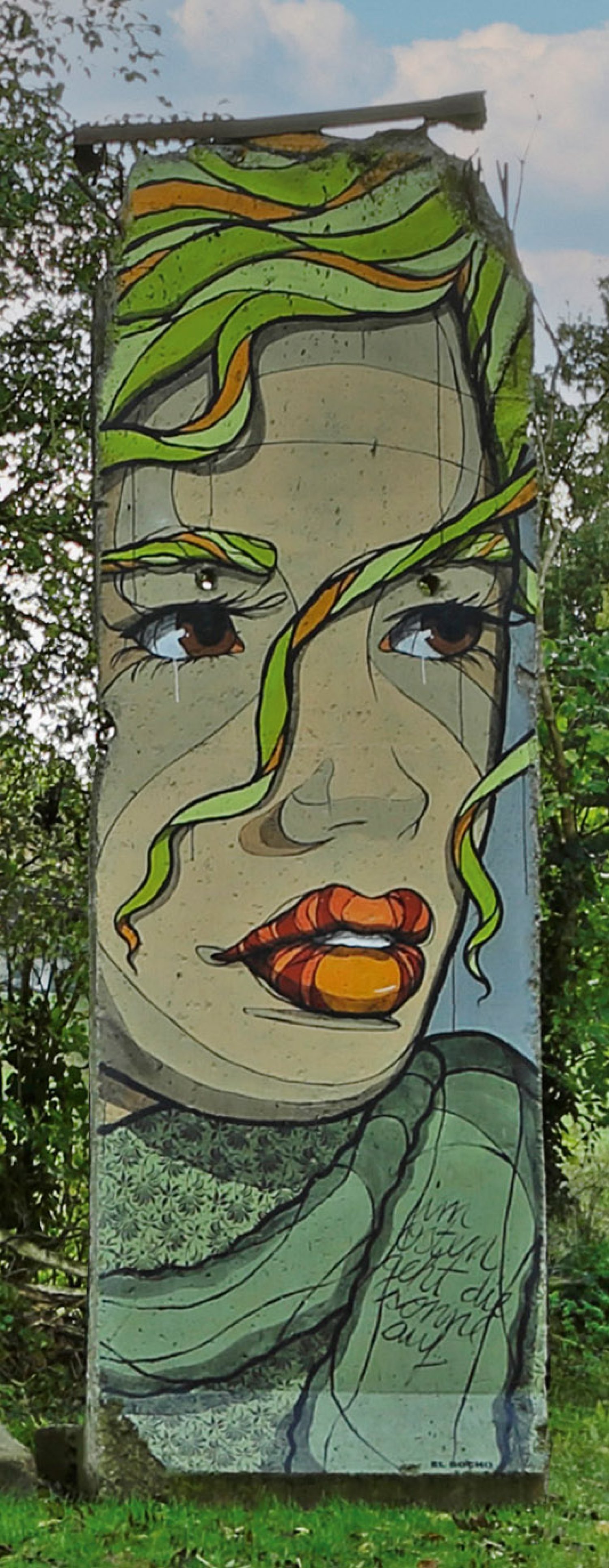 2020 entstandenes, sog. "Berlin Wall-painting". Großes, L-förmiges Stück der alten Berliner Mauer (Beton mit Stahl-Armierung) mit Bemalung durch El Bocho in unterschiedlicher Technik. Stencil-Sign. "EL BOCHO". Ausschnitthaft dargestellt ist ein Kopf eines Mädchens im Viertelprofil mit langem Haar, dessen grün-orangefarbene Strähnen ihr teilweise ins Gesicht fallen, unter ihren Augen herablaufende Tränen, rechts unten auf ihrer linken Schulter die Schrift "im Osten geht die Sonne auf". In mit diesem Mauerstück vergleichbaren Versionen hat El Bocho das Motiv des Mädchens mit Tränen auch als Grafik unter den Titeln "Fernweh" und "Girl with Tears" vervielfältigt. El Bocho, dessen Identität anonym ist, gehört zu den bekanntesten deutschen Streetart- und Graffiti-Künstlern. Er studierte Grafik-Design und arbeitete danach beruflich mit Typographie und Plakatkunst. Seit 1996 ist er anonym mit Graffiti- und Street-Art im öffentlichen Raum aktiv. 2006 zog er von Frankfurt am Main nach Berlin. Außer in seiner heutigen Wahlheimatstadt Berlin und in Deutschland ist er auch weltweit tätig. H. ca. 360 cm; B. ca. 118 cm; T. 212 cm.