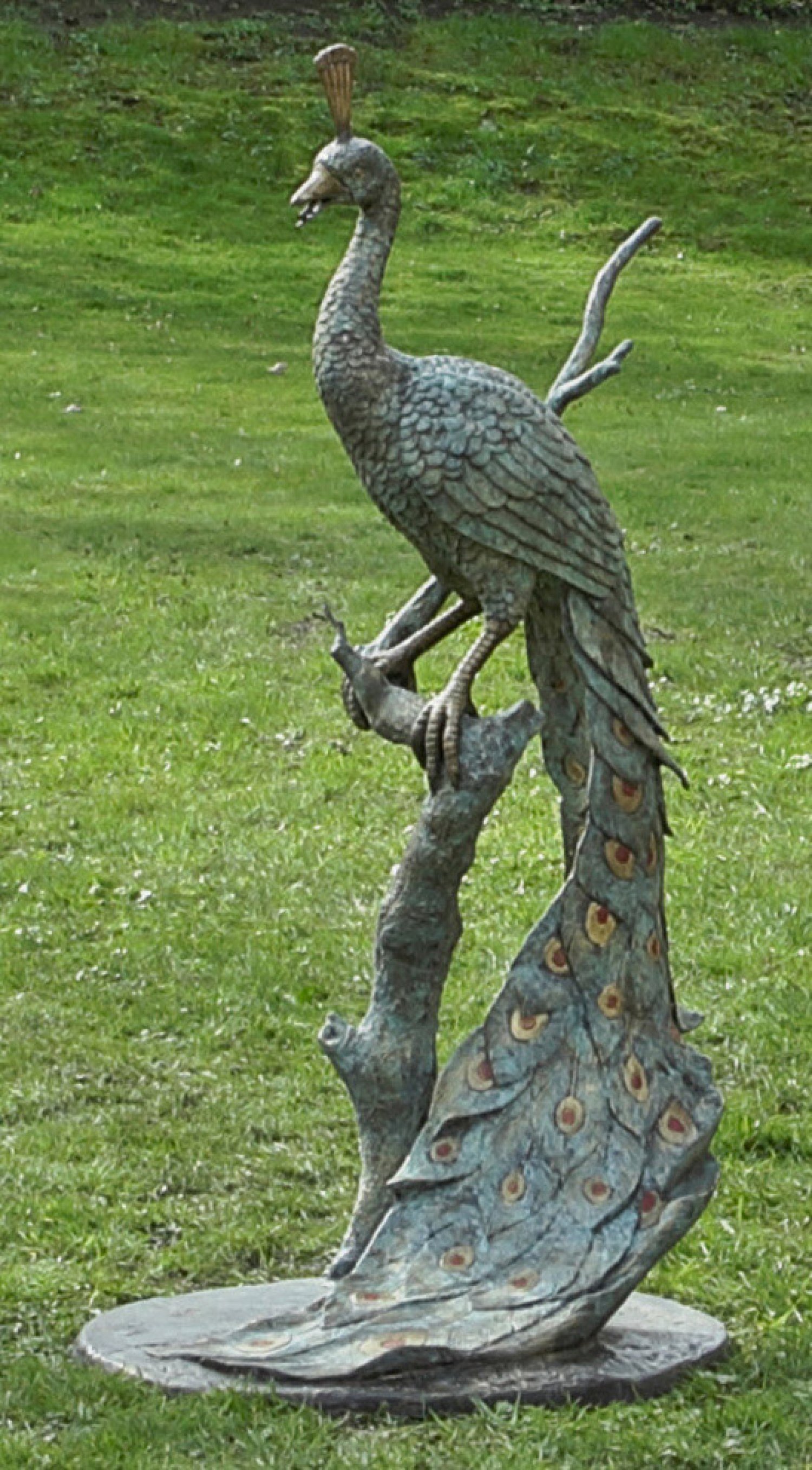 Bronze, patiniert, teilw. poliert und farbig bemalt. Dekorative, auch als Brunnenfigur konzipierte, vollplastische Darstellung eines auf einem Ast sitzenden Pfauhahns mit langem, effektvoll gearbeitetem Federkleid. H. 123 cm.