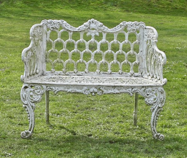 Gusseisen, weiß lackiert. Passig geschweifte Zarge auf stark geschwungenen Voluten bzw. Balusterbeinen. Durchbrochen gearbeitete, geschweift ansteigende Armlehnen aus gegeneinander gestellten C-Bögen sowie korrespondierende Rückenlehne aus Gitterwerk. Altersspuren. H. 91 cm. 112 cm x 43 cm. Sitz-H. 43 cm.