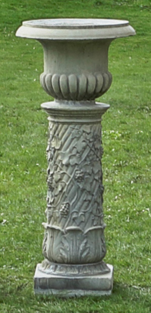 Gussstein. Über quadratischer Plinthe leicht konischer Schaft mit umlaufendem Fries aus Akanthus sowie flächendeckender, gedrehter Godronierung mit erhaben reliefierten Weinreben. Oberhalb Vasenelement mit weit ausschwingendem Lippenrand. Besch.; H. 94 cm.
