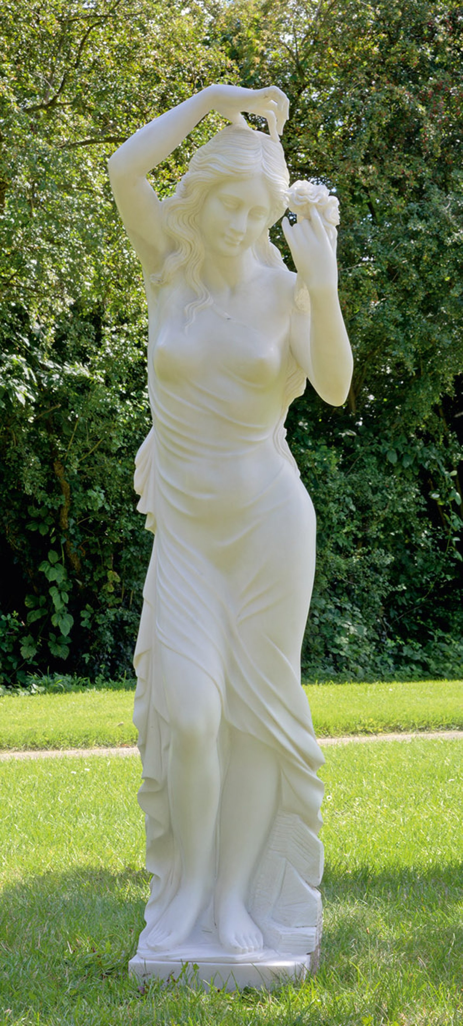Weißer Marmor. Lebensgroße, vollplastisch gearbeitete Statue als Garten- bzw. Parkskulptur. Im Kontrapost stehendes Mädchen in einem langen, leichten Kleid, das ihren Körper subtil durchscheinen lässt; die Hände in graziöser Pose mit Rosen bzw. über ihren Kopf gelegt. Rechte Hand ger. besch.; H. 178,5 cm.