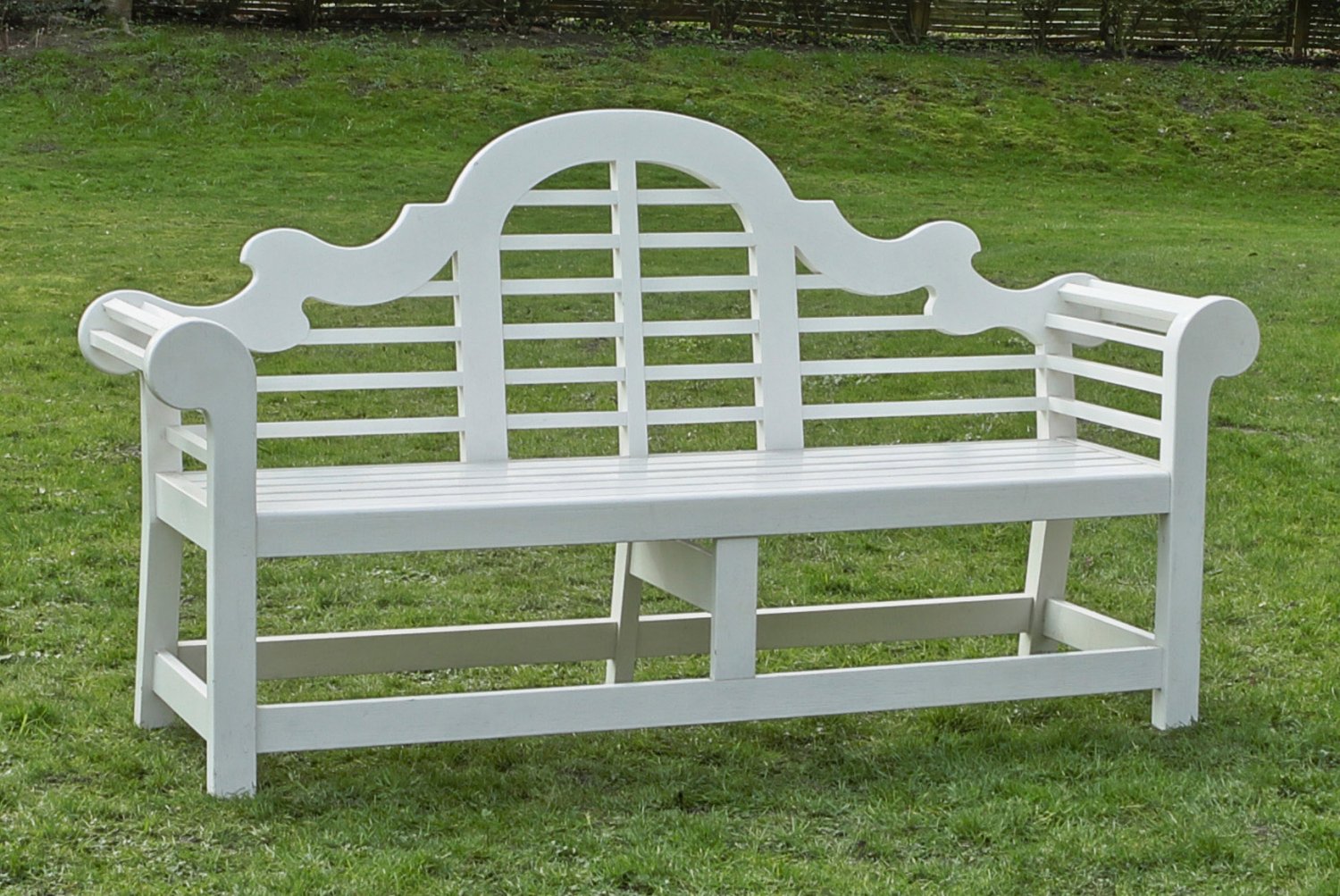 A large English white lacquered wood garden bench.